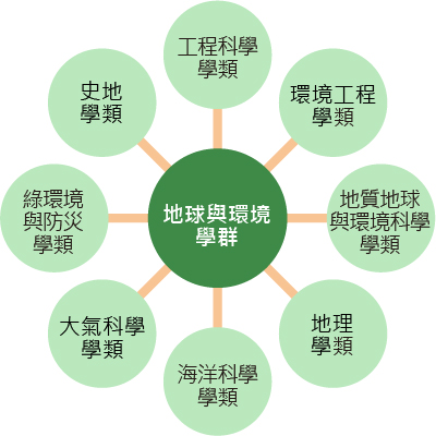 地球與環境學群包括有地球科學、地質、大氣、海洋科學、環境科學、防災等學類,主要探討各種自然環境、資源及人文現象的分布及特色,汙染的成因與防治,探測地下資源,了解海洋大氣的變化,繪製地圖等的科學理論及工程技術。隨著全球氣候與環境的變遷,此學群逐漸受到重視。