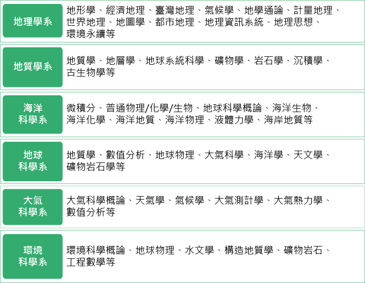 國中小老師、高中職老師、氣象相關研究人員、地質與地球科學研究人員、天文相關研究人員、應用科學研究人員、物理相關研究人員、研究助理、水土保持技師、採礦工程師、測量師、環保/環境工程師/技師、農藝/畜產研究人員、公家機關相關人員等。生涯發展與職場趨勢