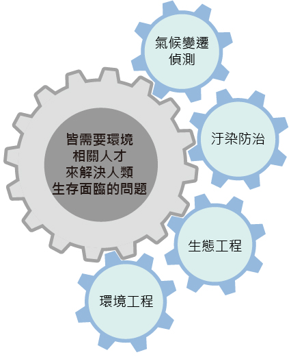 過去,地球與環境學群畢業生的未來出路主要以學校、研究單位、政府機關為多,但近年隨著環境議題熱燒,永續發展及綠能科技受到矚目,因此,環境相關人才在產業界中漸漸受到重視。
