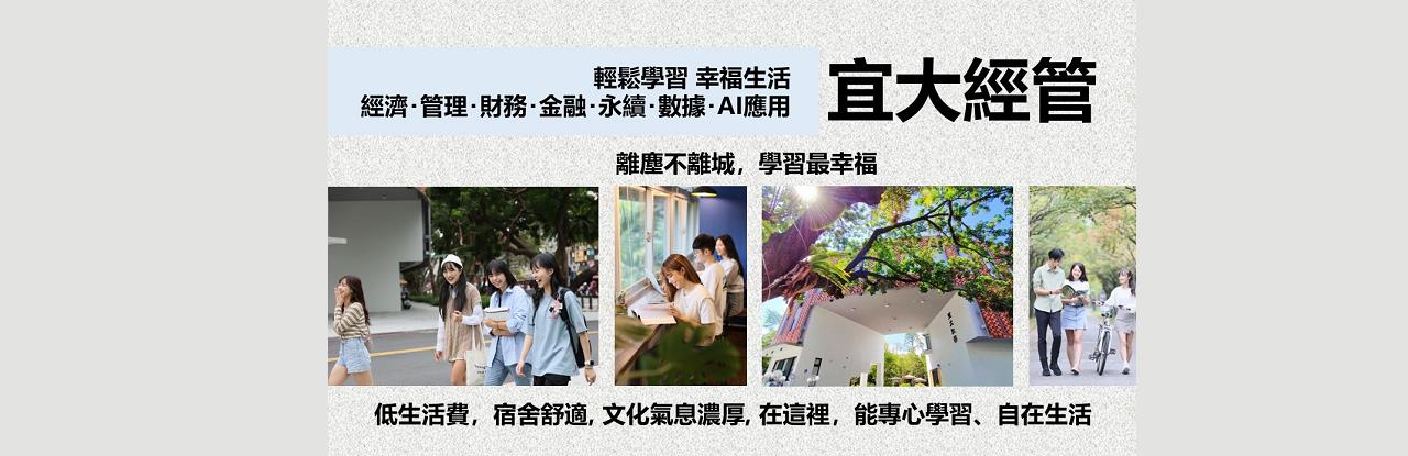 國立宜蘭大學應用經濟管理學系以 經濟思維 × 管理實戰 × 財金決策 × AI 與大數據 打造你的商業超能力,不只教知識,更教你 會分析、敢決策、能協調、能解決問題。
