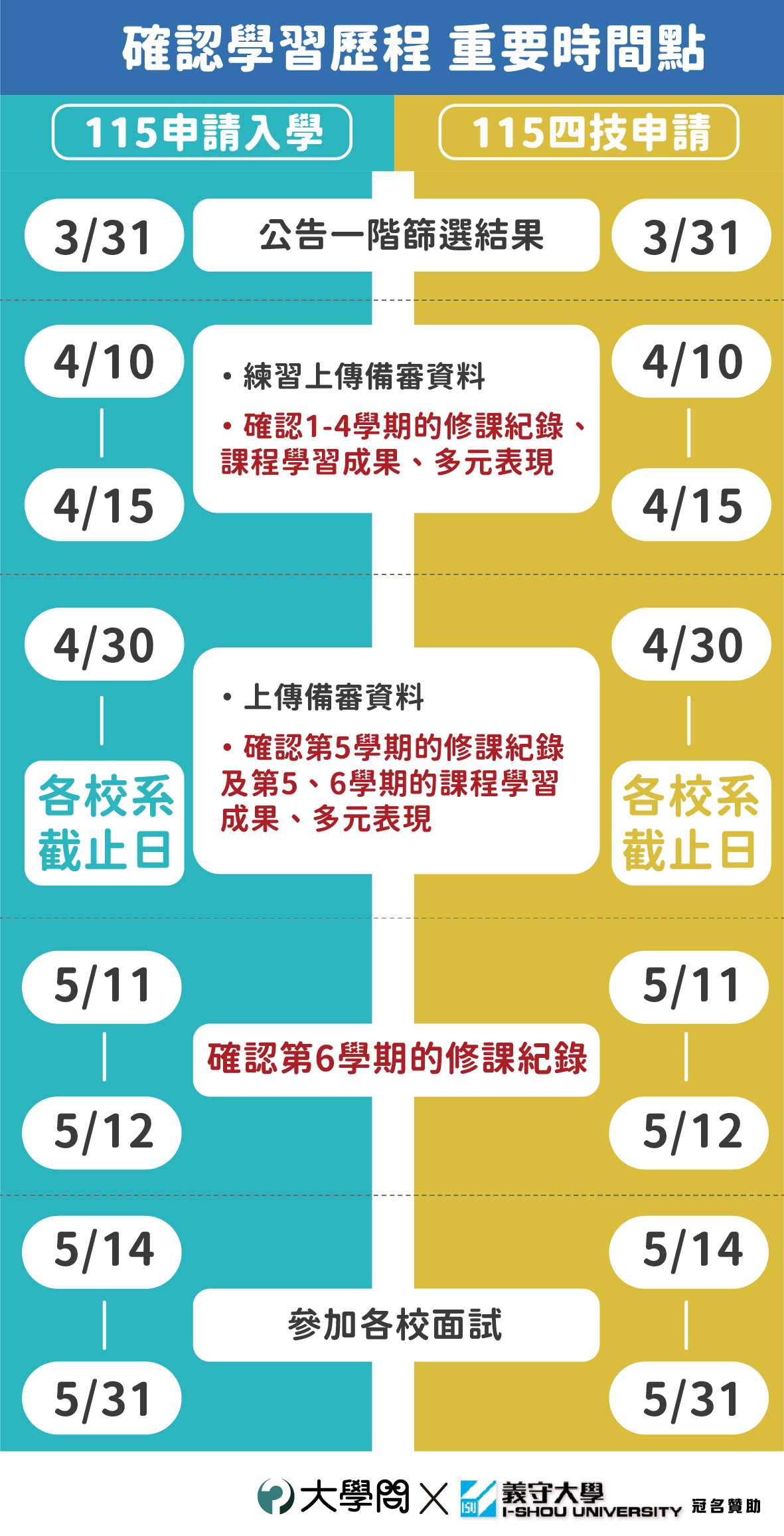 同樣的,參加「四技申請」也有三個時間點要請考生至四技申請招生官網的「考生作業系統」,確認學習歷程檔,分別是:4月10日、4月30日、5月11日。