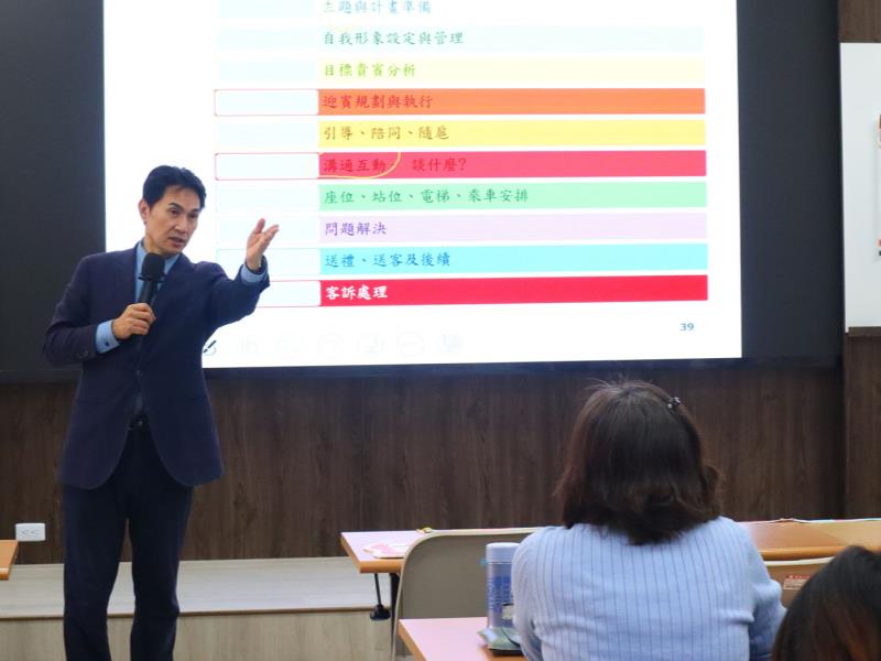 本次培訓活動以英語溝通能力建構為首要,透過「職員英語溝通培訓工作坊」之兩場核心課程,從實務需求出發,協助同仁能以條理清晰的英語導覽校內網頁系統,並在「國際賓客英文接待」情境中靈活運用實務用語,讓外籍師生與來訪外賓能獲得精準且高效率的行政協助。除了語言工具的掌握,南華大學更辦理「職員國際文化禮儀培訓工作坊」,特別邀請曾任職於總統府典禮交際單位、現任中華青年友好訪問協會副理事長李銓鑫蒞校授課。