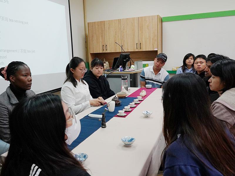本次活動特別邀請來自嘉義在地知名茶空間的「嘉木居」店長林菀亭主講,詳盡介紹臺灣山茶的歷史脈絡、臺灣茶的發展背景、茶葉種類、茶器具認識、茶席美學,以及品茗技巧等豐富精采的內容。為了讓境外生了解介紹內容,副國際長林倫全更負責翻譯英文。