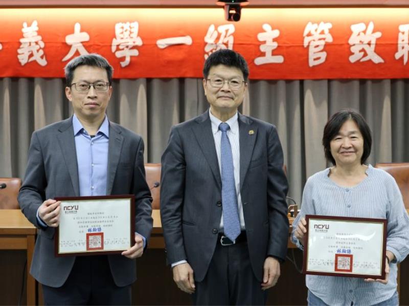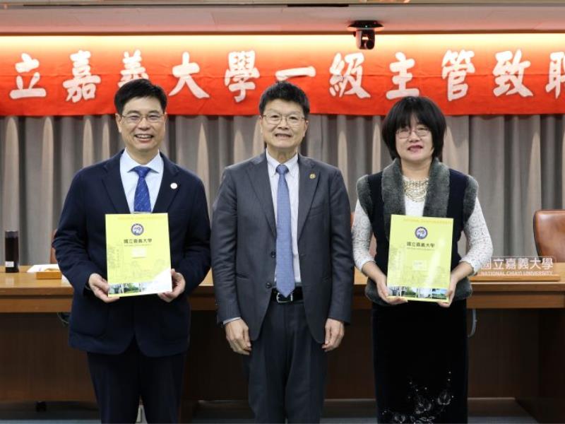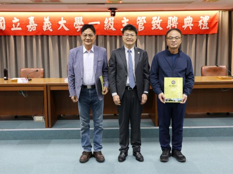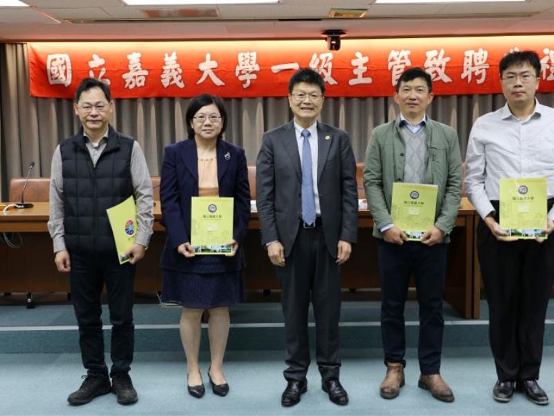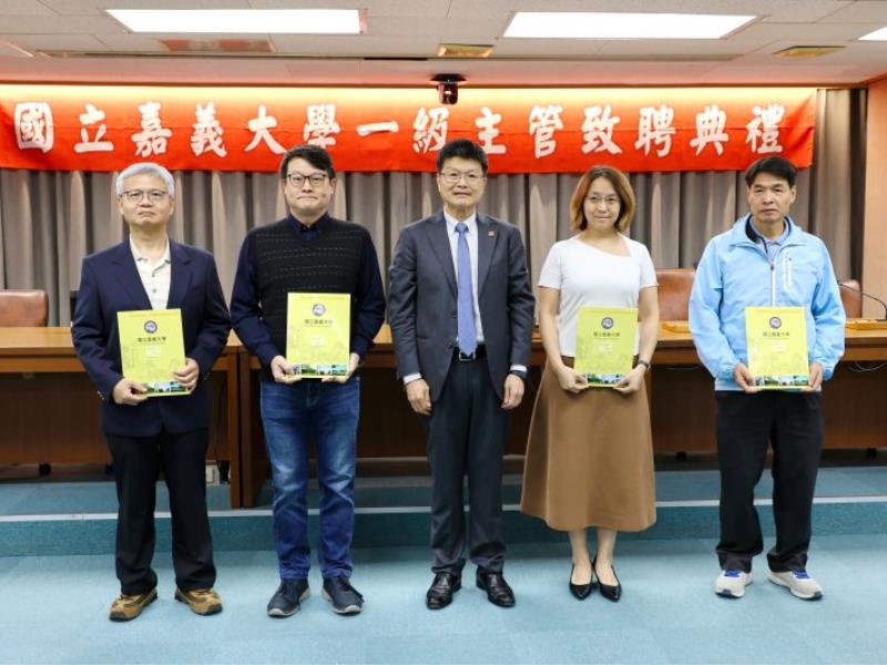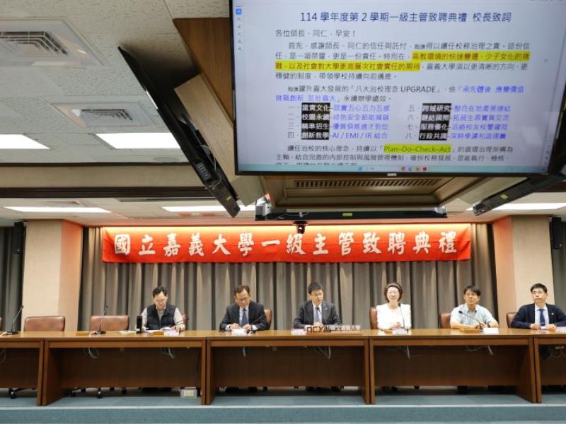 嘉義大學1月30日於蘭潭校區瑞穗廳舉行114學年度第2學期一級主管致聘典禮,計有七位學術主管接任新職,分別為音樂學系楊千瑩主任、科技管理學系李振宇主任、財務金融學系陳乃維主任、木質材料與設計學系何尚哲主任、農場管理進修學士學位學程陳鵬文主任、土木與水資源工程學系陳建元主任及電機工程學系張慶鴻主任。