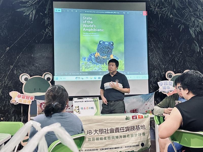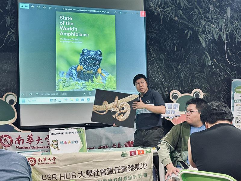 圖02.南華大學辦理工作坊,由旅遊管理學系副教授許澤宇解說諸羅樹蛙與兩棲類生態保育議題。
