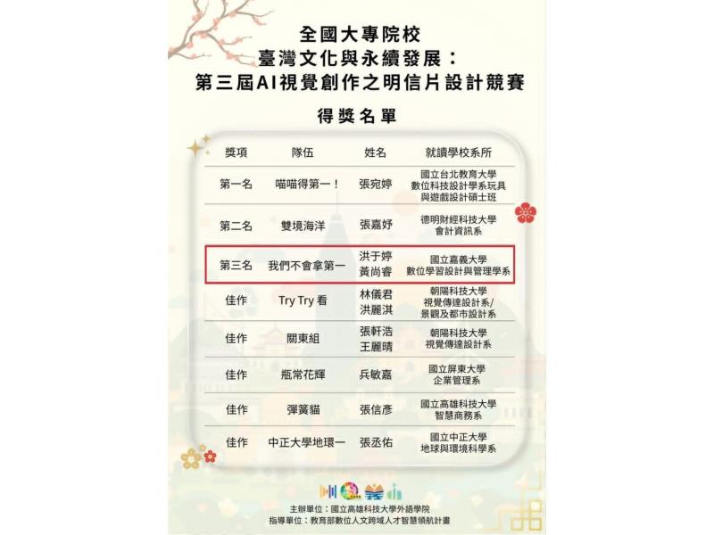 嘉義大學數位學習設計與管理學系大二洪于婷、黃尚睿同學,在該系王秀鳳教授指導下,參加由高雄科技大學外語學院執行、教育部指導之「數位人文跨域人才智慧領航計畫」所舉辦的「全國大專院校台灣文化與永續發展:第三屆AI視覺創作之明信片設計競賽」,表現亮眼,榮獲第三名佳績。