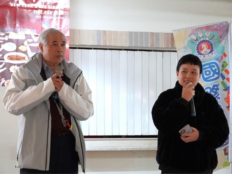 ▲副校長兼國際專修部主任林育立(圖左)致詞關心學生健康與安全,並以馬年祝福勉勵同學學業順利、未來發展順心。(圖右為工管系越南籍何橋妝同學)