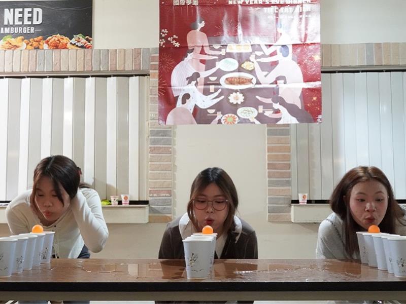 現場互動最受歡迎的是「開口就發財」,鼓勵同學上臺以中文互道祝福,從「恭喜發財」、「年年有餘」到「萬事如意」,在笑聲與掌聲中熟悉年節用語與華語音韻;「新春好運來」以杯子、乒乓球與水設計闖關,寓意「步步高升」、「喜氣連連」,讓文化學習化為生動體驗。用餐採自由交流,同學分享家鄉年菜與過年故事,跨文化對話在餐桌間自然展開。