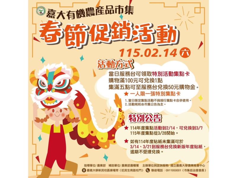 圖1:嘉大有機農產品市集2月14日舉辦春節促銷活動文宣。