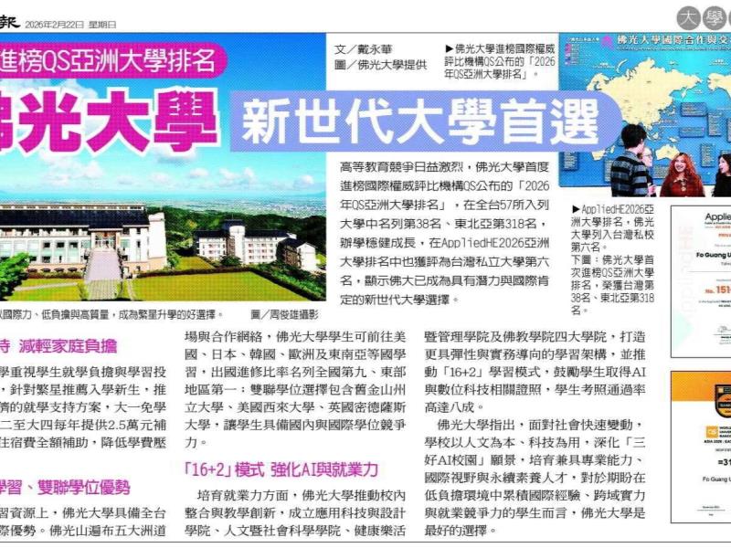 高等教育競爭日益激烈,佛光大學首度進榜國際權威評比機構QS公布的「2026年QS亞洲大學排名」,在全台57所入列大學中名列第38名、東北亞第318名,辦學穩健成長,在AppliedHE2026亞洲大學排名中也獲評為台灣私立大學第六名,顯示佛大已成為具有潛力與國際肯定的新世代大學選擇。
