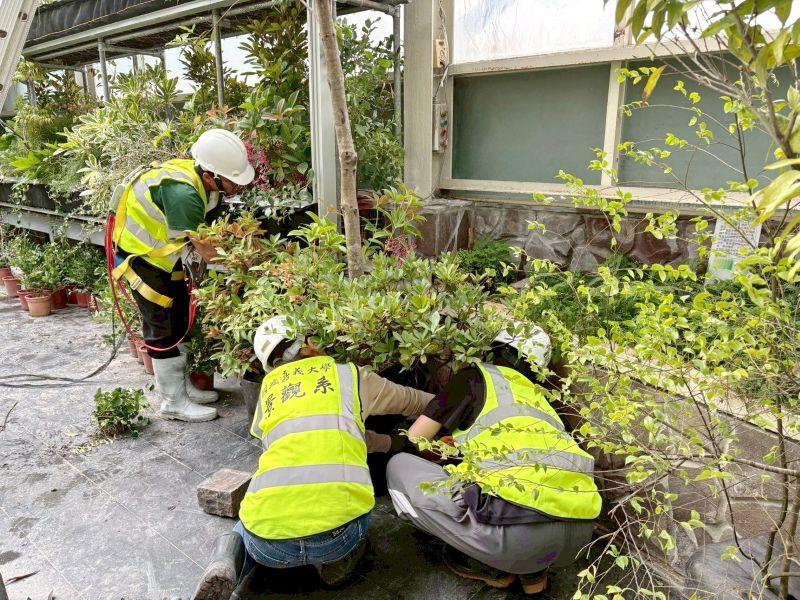 圖4:嘉義大學景觀學系學生合力為展場大型植物換盆。