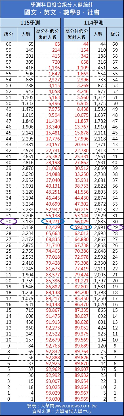 再來,看看自己的今年學測級分累計人數為多少,再找出114年最相近的累計人數值,就可得知115學測級分約等於114年的幾級分了。舉例來說,志銘今年學測報考「國英數B社」,他的四科總級分為30,由下圖中可見,115年30級分的累計人數為59,271人,較接近114年的59,020人,因此115年的30級分約等於114年的29級分。在參考去年各系的學測錄取成績時就要將這點差距考量進去。