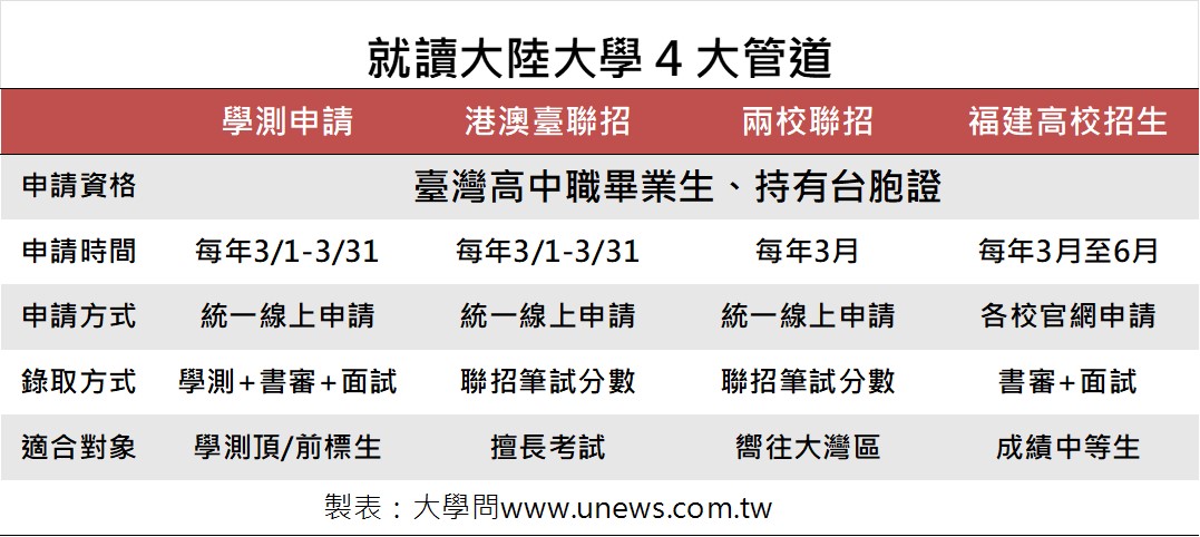 高中職畢業生想要就讀大陸大學,有四個入學管道,包括:「學測申請」、「港澳臺聯招」、「兩校聯招」、「福建高校招生」。只要持有台胞證,不管是應屆或非應屆都可以報名。有興趣的同學請留意每年3月的報名期,並詳閱簡章。