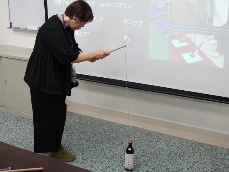 ▲宮城教育大學高橋亞紀子老師親身體驗臺灣傳統遊戲「釣酒瓶」,在輕鬆愉快的互動中感受中華大學學生用心安排的在地文化魅力。
