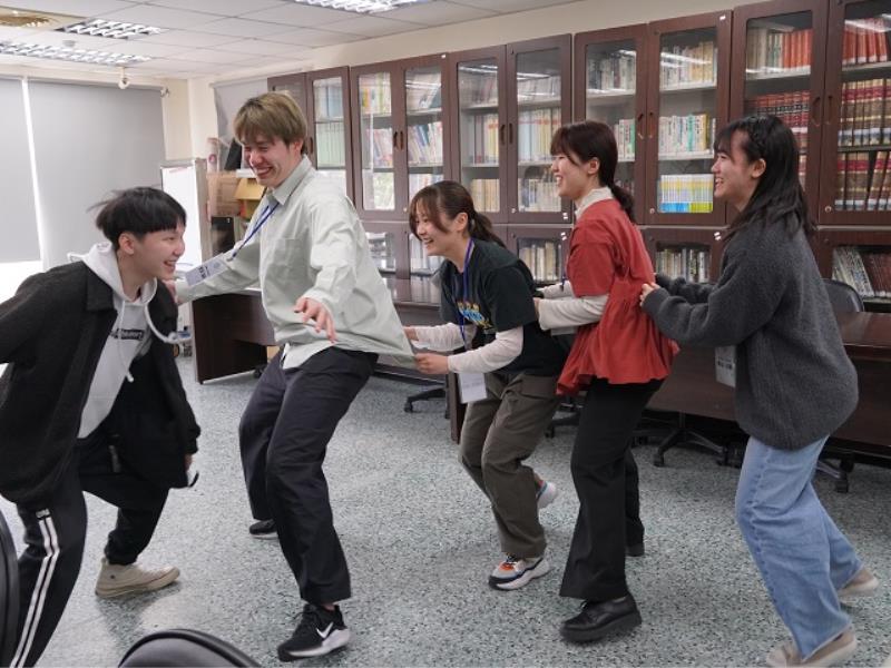 ▲交流活動中,日本學生加入「老鷹抓小雞」遊戲,歡笑聲不斷,透過童玩體驗迅速拉近與中華大學學生之間的距離。
