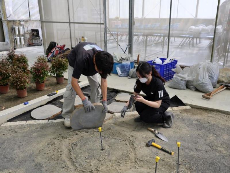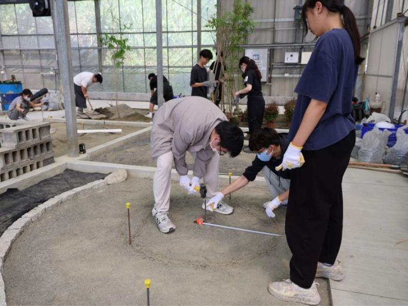 造園景觀實作場主要規劃倉庫區、造園景觀乙級練習場區與造園景觀植物種植區。其中,練習場共設置15處可施作地,提供學生進行造園景觀施工實作練習;造園景觀植物種植區則協助學生掌握在地物種的特性與應用,提升專業技能與實務能力。