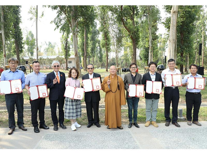 圖02.南華大學創校30週年校慶,進行「百年樹人・永續南華」植樹活動,感謝法務部前部長施茂林(左5)及各界人士捐贈樹木,高俊雄校長(左3)致贈感謝狀。