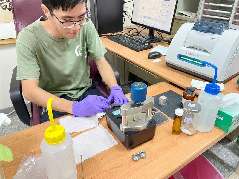 圖3:嘉大農藝系林沛倫同學以KBr壓片法製備樣品後進行FTIR光譜量測。