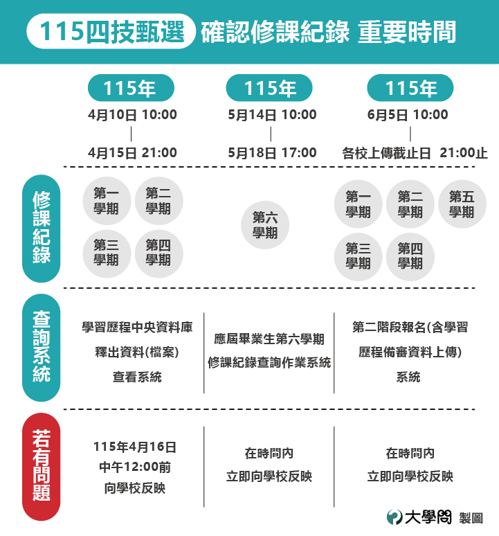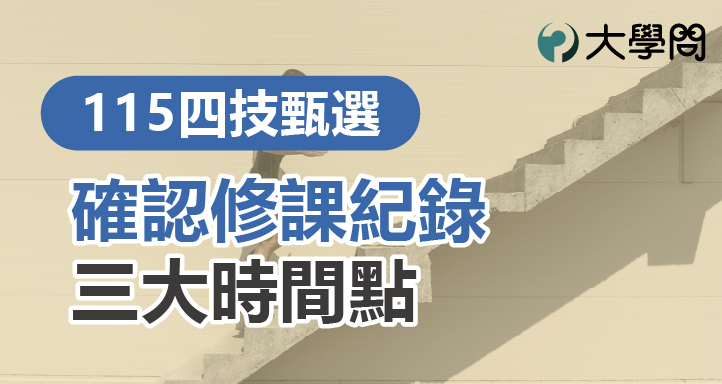 請考生在115年4月10日、5月14日、6月5日三個時間點,至「技專校院招生委員會聯合會-四技甄選」網站,點選「考生作業系統」,進入相關查詢系統確認自己的修課紀錄是否正確。