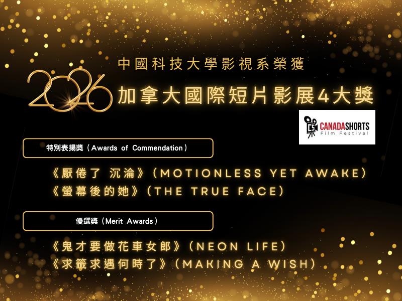 2026年自加拿大傳來捷報,年度國際級影展盛事之加拿大國際短片影展(Canada Shorts - International Short Film Festival)中,中國科技大學影視設計系師生展現豐沛創作能量,共有4部作品在激烈的國際競爭中脫穎而出,分別榮獲「特別表揚獎(Awards of Commendation)」與「優選獎(Merit Awards)」,再度向國際展現台灣影視教育的實力與獨特的敘事觀點。