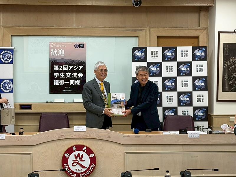 圖02.南華大學舉辦亞洲學生交流會議,高俊雄校長(左)致贈紀念品予小山哲夫代表(右)。