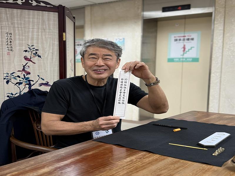 圖05.南華大學舉辦亞洲學生交流會議,亞洲中東政治經濟研究所代表小山哲夫代校園導覽中書寫南華大學創辦人星雲大師祝福法語。