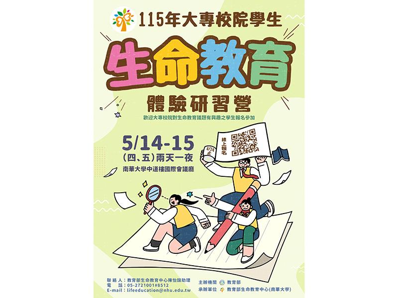 為引導大專校院學生深化生命教育素養,培養自我覺察、同理關懷與社會參與能力,教育部生命教育中心(南華大學)將於5月14日至15日辦理「115年大專校院學生生命教育體驗研習營」,預計邀集全國各大專校院學生社團幹部及對生命教育議題有興趣之學生,共同參與兩天一夜的深度學習與體驗歷程。