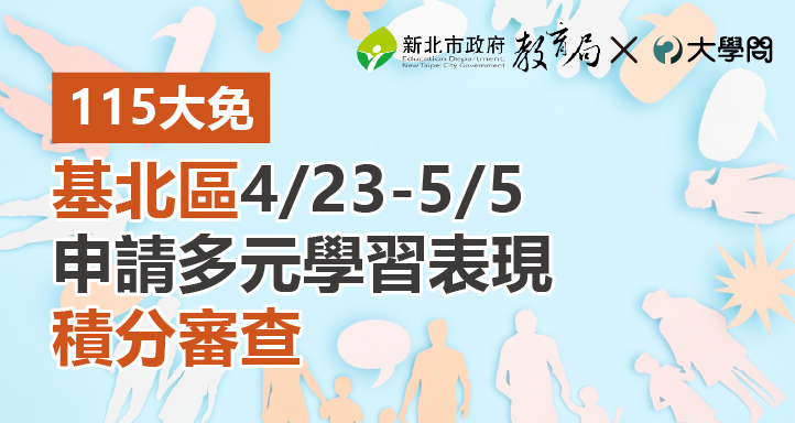 基北區個別報名「大免」(就學區免試入學)的國中非應屆畢業生、同等學力生,以及海外臺校應屆畢業生,須於115年4月23日至5月5日間,向原就讀國中申請多元學習表現積分審查,並於期限內寄出申請表。若未於時限內完成申請,則多元學習表現積分將以0分計算,還請個別報名的考生留意。