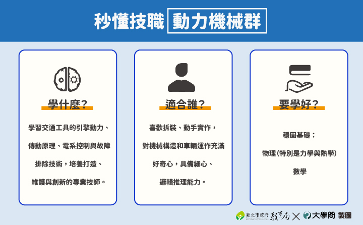 動力機械群包括:汽車科、重機科、飛機修護科、動力機械科、農業機械科、軌道車輛科,聚焦在各種動力車輛與機具。選科前先想想:「我最想修哪種車?」