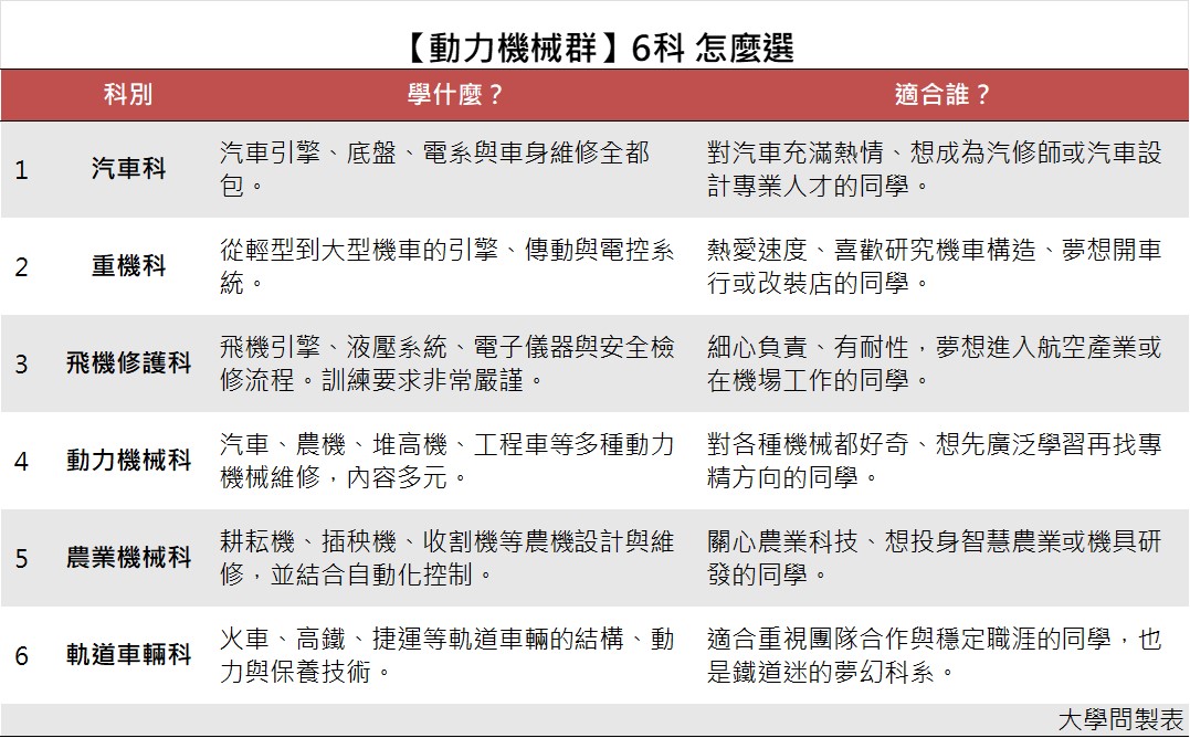 動力機械群6科 怎麼選?