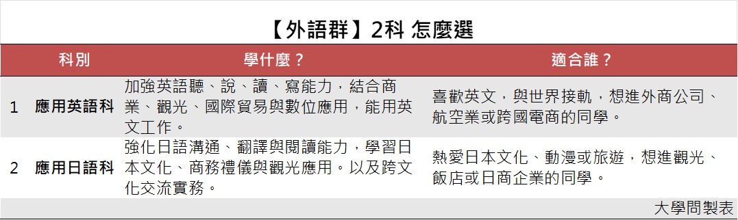 外語群包括:應用英語科和應用日語科。選擇時,最重要的關鍵是興趣。如果對英語特別有感覺,想用英語與世界溝通,那「應用英語科」會是好選擇。而如果對日本文化、動漫、戲劇有濃厚興趣,想學好日語,那「應用日語科」會更適合。
