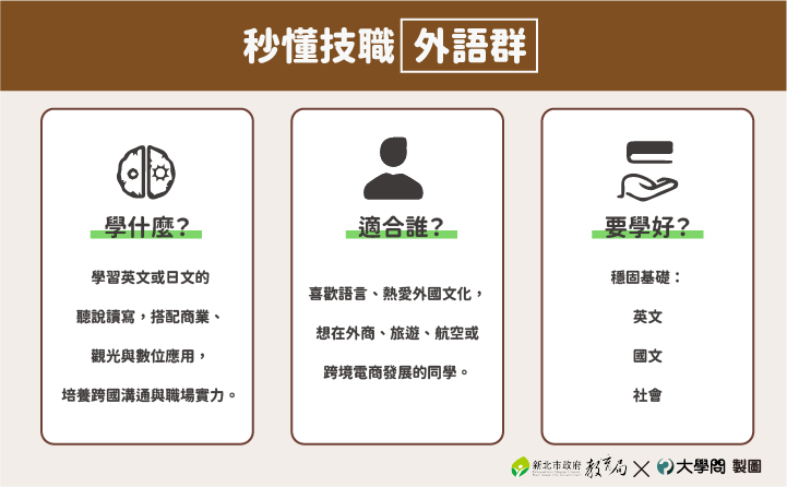 國際化時代,語言能力不只是「興趣」,而是許多行業的必備技能。從旅遊、貿易到科技產業,懂外語的人幾乎都更能抓住跨國機會。技高的「外語群」不只是學語言,更教你如何運用語言去工作、溝通、開創機會。課程通常結合語言、商業、觀光與科技,是培養國際人才的起點。如果你喜歡學習新語言、想了解不同國家文化,外語群是個好選擇。
