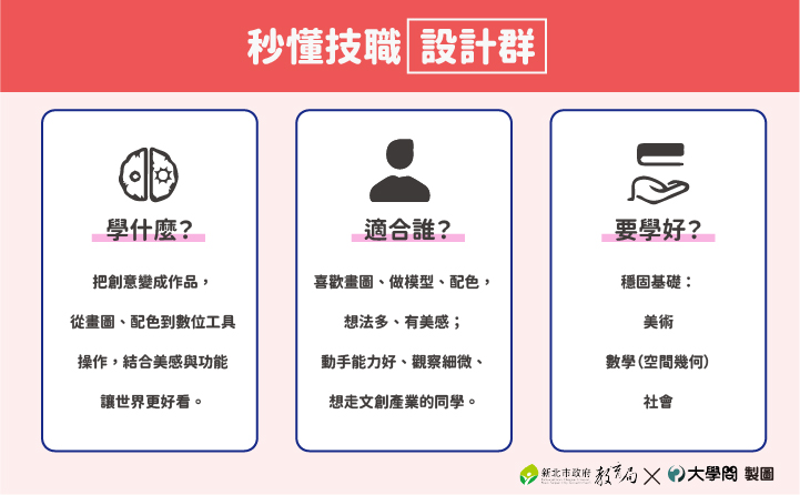 「設計」不只是「畫圖」,而是把創意轉成實際產品與空間的學問。技高的「設計群」就是專門培養這些充滿創意、能將想法化為實際作品的專業人才。從品牌包裝、動畫遊戲、家具空間到傳統工藝,幾乎涵蓋所有「美感與功能」相關的領域。如果你喜歡畫畫、對色彩和造型很敏銳,熱衷將腦海中的想法付諸實現,那設計群能讓你變成美感創意魔術師。