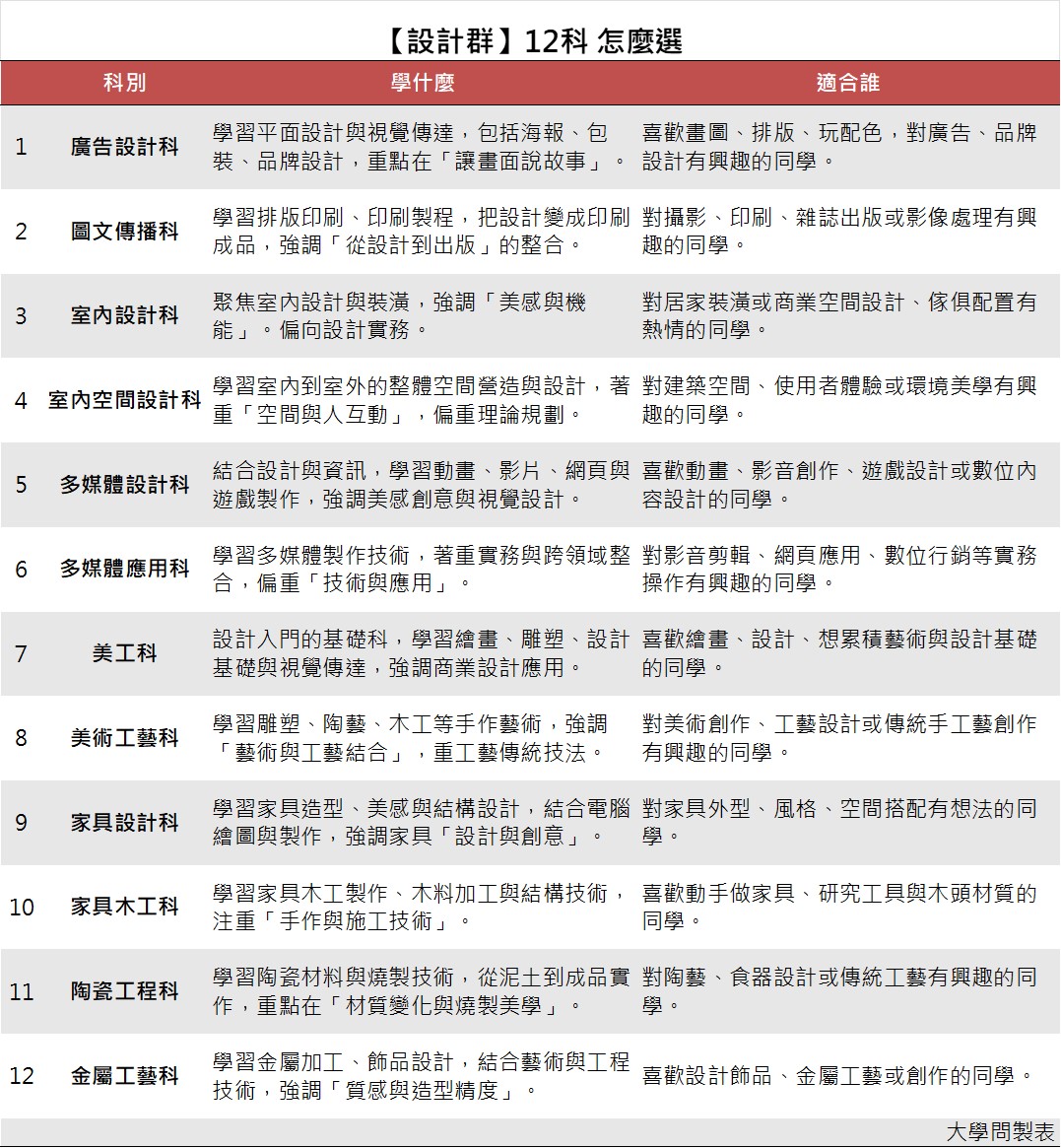 如果對視覺傳達有興趣,可以選擇「廣告設計科」;對空間設計有熱情,可以考慮「室內設計科」或「室內空間設計科」,兩者核心都是如何規劃、美化室內空間。