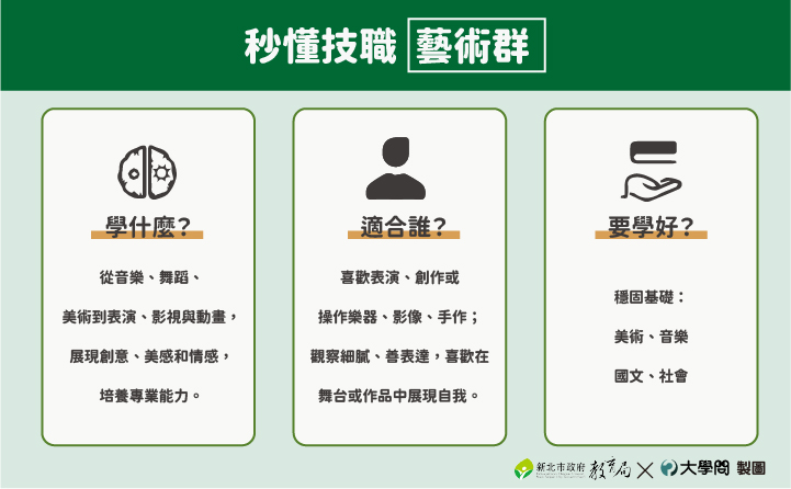 技職的「藝術群」,就是在訓練把腦中創意、情感和天分,用音樂、舞蹈、繪畫、設計等形式確實表現出來。除培養創造力、審美力和專注力,把抽象的美感變成具體技能外,也能用作品說故事、與觀眾溝通。如果你喜歡表演、音樂、舞蹈或繪畫,藝術群就是讓興趣變專長、把專長變成未來工作的最佳選擇。