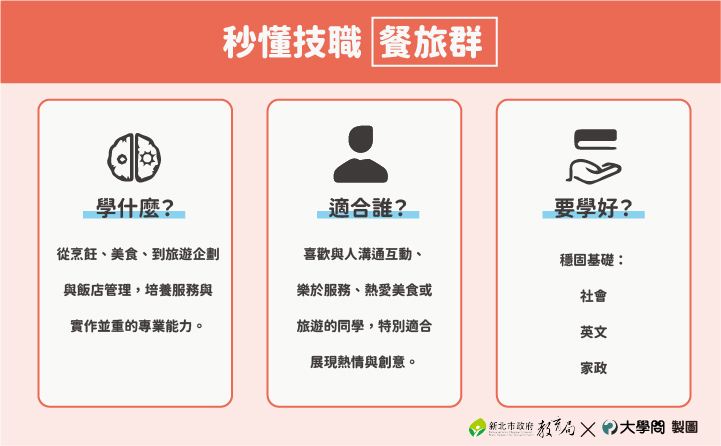 技職「餐旅群」專門培養服務業人才,從烹飪美食、規劃旅程,到經營飯店與餐廳,學的都是讓人吃得開心、玩得滿意的專業。這是一個貼近生活、能讓你把熱情變成職場實力的群別。如果你喜歡與人互動、樂於服務他人,或對美食、旅遊充滿熱情,餐旅群絕對是能讓你展現魅力的舞台。