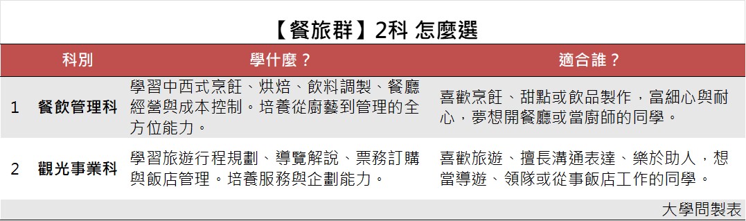 餐旅群包括:餐飲管理科、觀光事業科,一個專攻「吃」,一個負責「玩」,都屬於服務業。