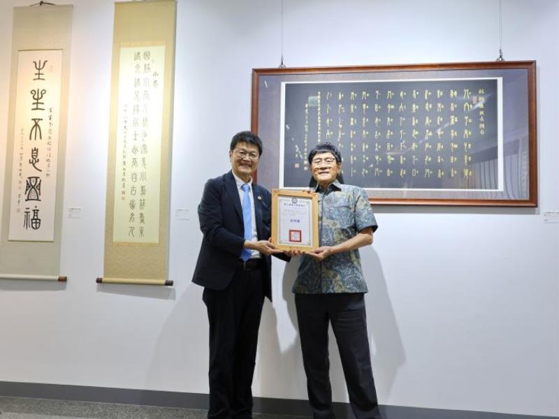 圖1:林翰謙校長代表嘉大致贈感謝狀,感謝黃昭善老師無償捐贈篆書作品《畢業一甲子》