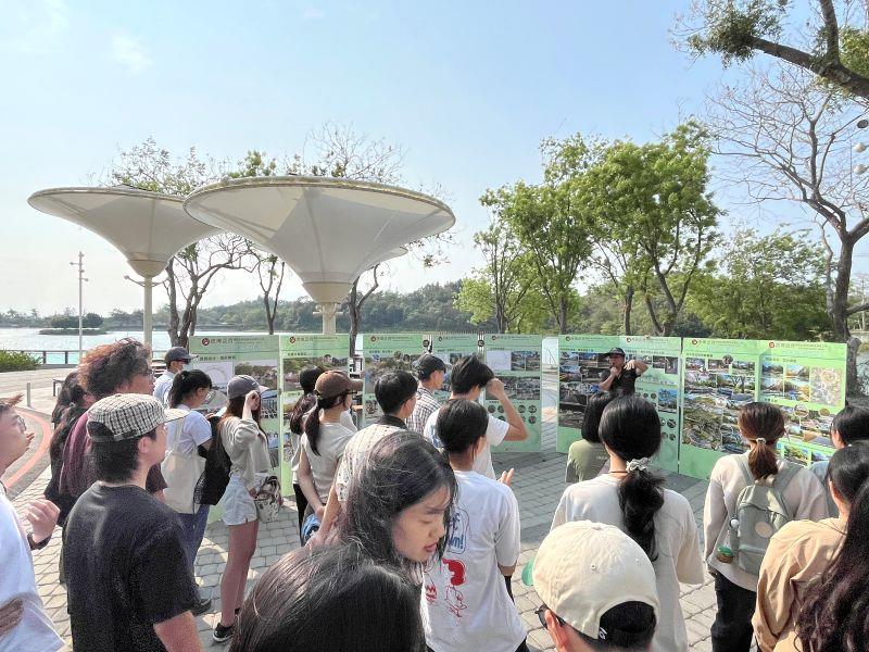 圖3:嘉大景觀系參訪師生於臺南市虎頭埤生態與人文教育園區全齡式地景遊憩場合照。