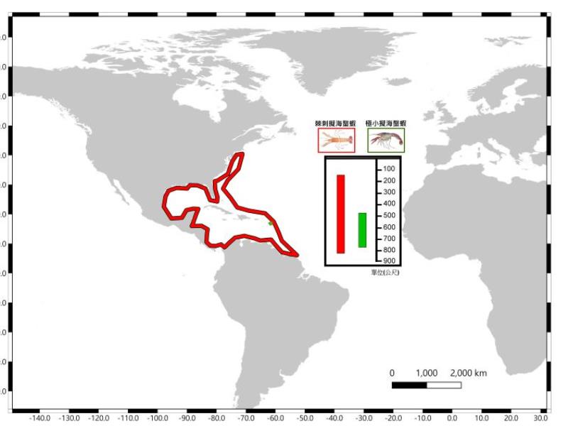 圖4:極小擬海螯蝦與棘刺擬海螯蝦兩物種地理與深度分布重疊,故過去被誤認為是同一種。