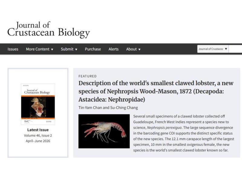 嘉義大學生物資源學系張素菁副教授與臺灣海洋大學陳天任教授合作,成功發現目前全球已知體型最小的龍蝦新種,並命名為「極小擬海螯蝦(Nephropsis perexigua)」,研究成果已發表於國際SCI期刊《Journal of Crustacean Biology》,並獲得該期刊的專題報導。