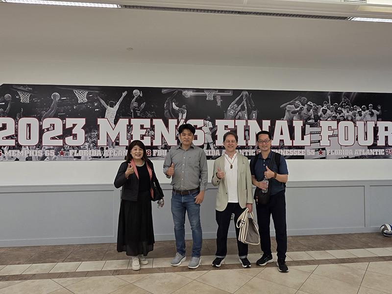 圖03.南華大學培育棒球菁英名揚國際,赴美訪視旅美選手,葉月嬌副校長(左1)、運動學程許伯陽主任(右1)與FAU Holloway教授(右2)及黃俊榮教授(左2)合影。
