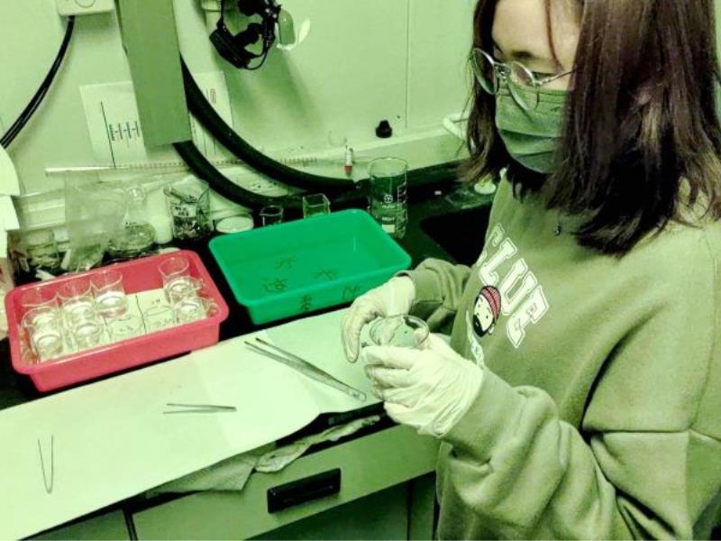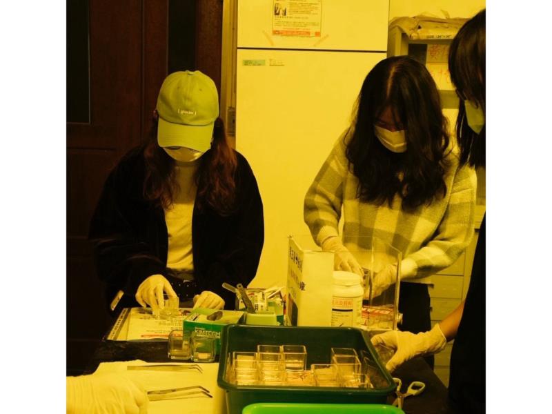 圖5:學生在黃光室進行半導體實驗-微影製程(顯影)。