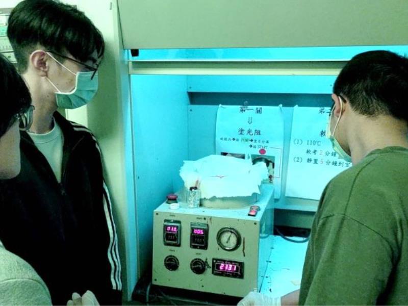 圖6:學生在黃光室進行半導體實驗-微影製程(旋轉塗佈光阻)。