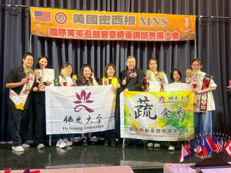在剛圓滿落幕的 2026 MNS 國際菁英盃競賽(International Elite Competition) 中,佛光大學蔬食系學生憑藉精湛的「果凍花」技藝驚豔全場,從全球眾多好手中脫穎而出,一舉斬獲 6 面金牌、3 面銀牌、6 個菁英獎及 2 個金手獎,總計 17 項大獎,充分展現「全台最強蔬食系」的堅強實力。