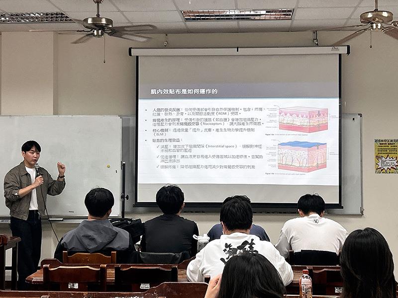 圖01.南華大學舉辦貼紮實作課程,由運動與健康促進學士學位學程杜繼超老師授課,講解肌內效貼紮原理。