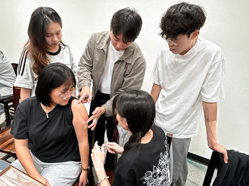 圖04.南華大學舉辦貼紮實作課程,學生互相進行肩頸酸痛貼紮實作練習。