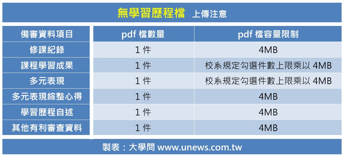 考生若無學習歷程檔,如非應屆、重考生、同等學力報考生或境外學歷生等,則可將備審資料所需的項目分項製成pdf檔,再逐一上傳。其中「修課紀錄」需上傳6個學期的成績單。
