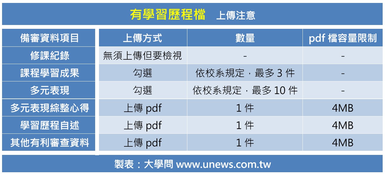 考生若有學習歷程檔,可選擇要勾選學習歷程檔或自製pdf檔上傳。在上傳時,請先檢視系統中第1到5學期的「修課紀錄」是否正確,並依校系要求勾選「課程學習成果」、「多元表現」等項目上傳,勾選件數的數量限制請留意各系組的規定;最後再將自行製作的「多元表現綜整心得」以及「學習歷程自述」或「其他有利審查資料」等pdf檔上傳,每項pdf檔的大小以4MB為限。