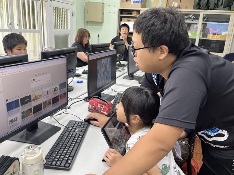 ▲中華大學資工系學生助教一對一引導學童操作 AI 工具,以陪伴式教學拉近科技與孩子的距離。